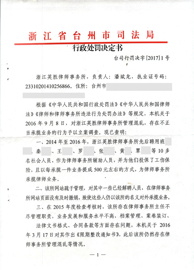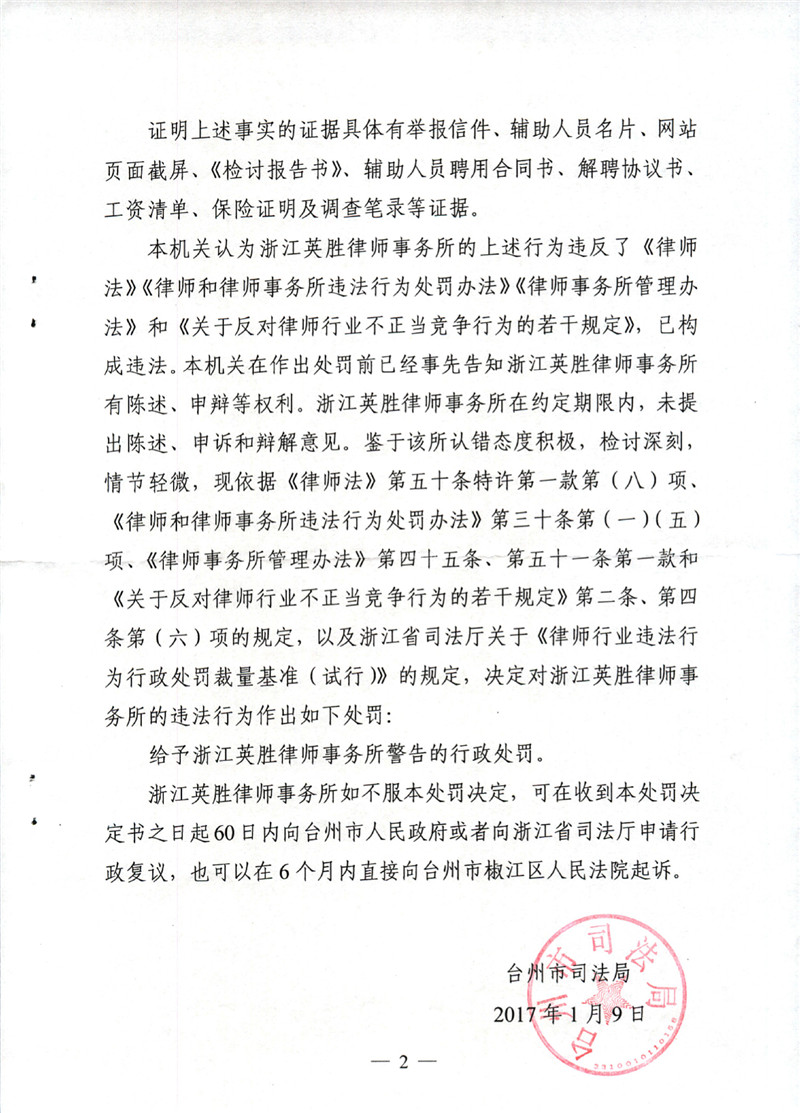 台州市司法局关于浙江英胜律师事务所的行政处罚决定书