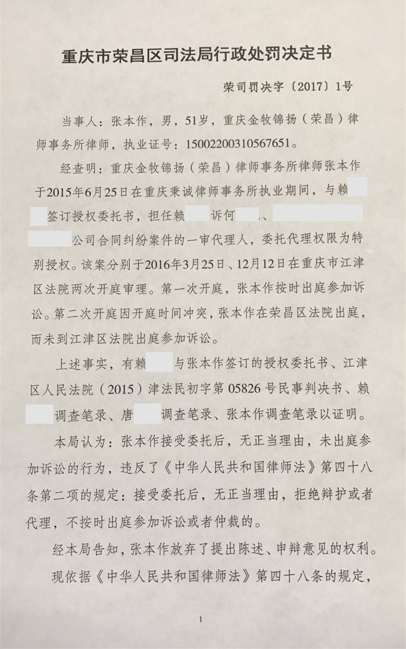 张本作无正当理由不出庭参加诉讼受警告行政处罚