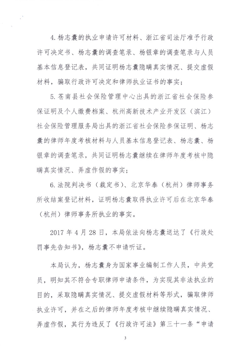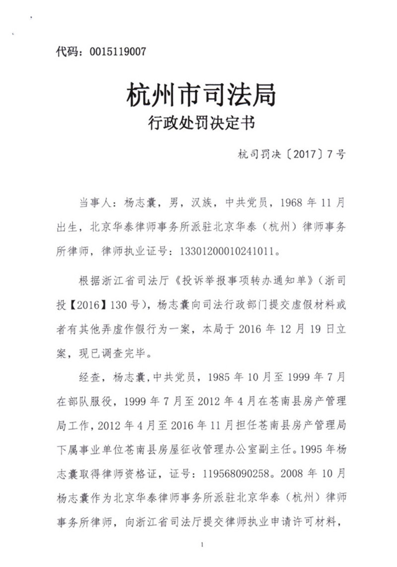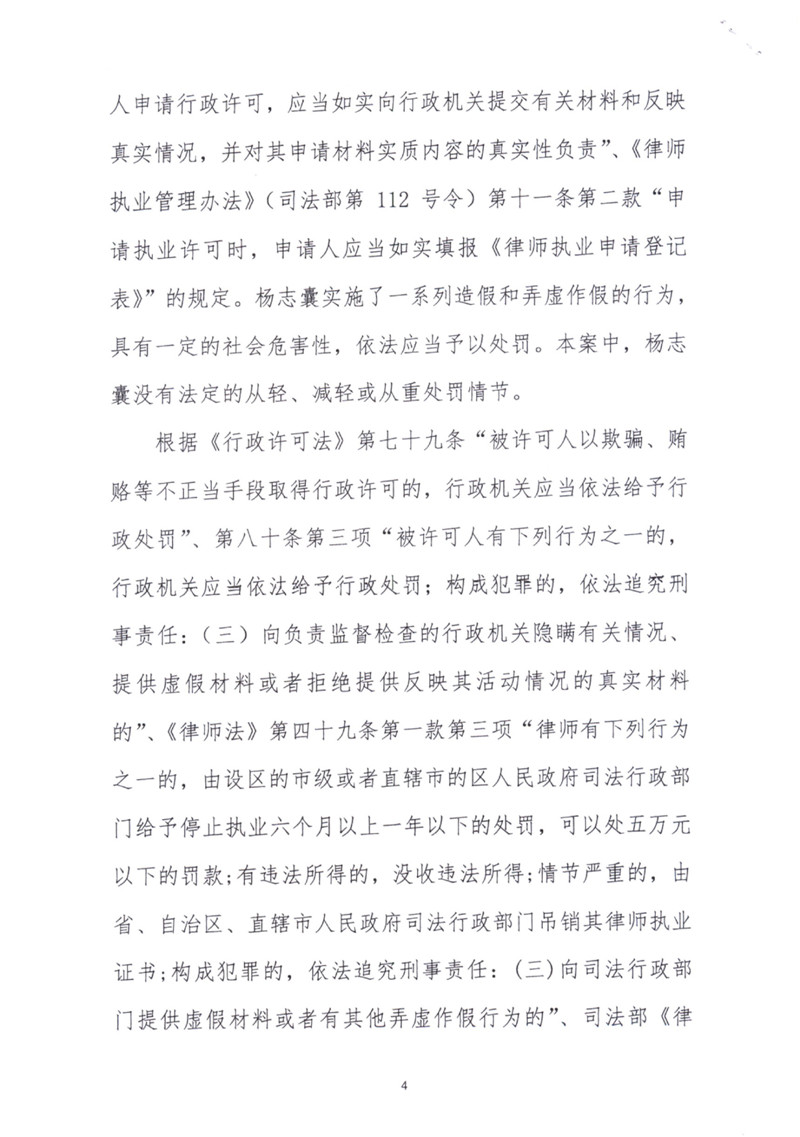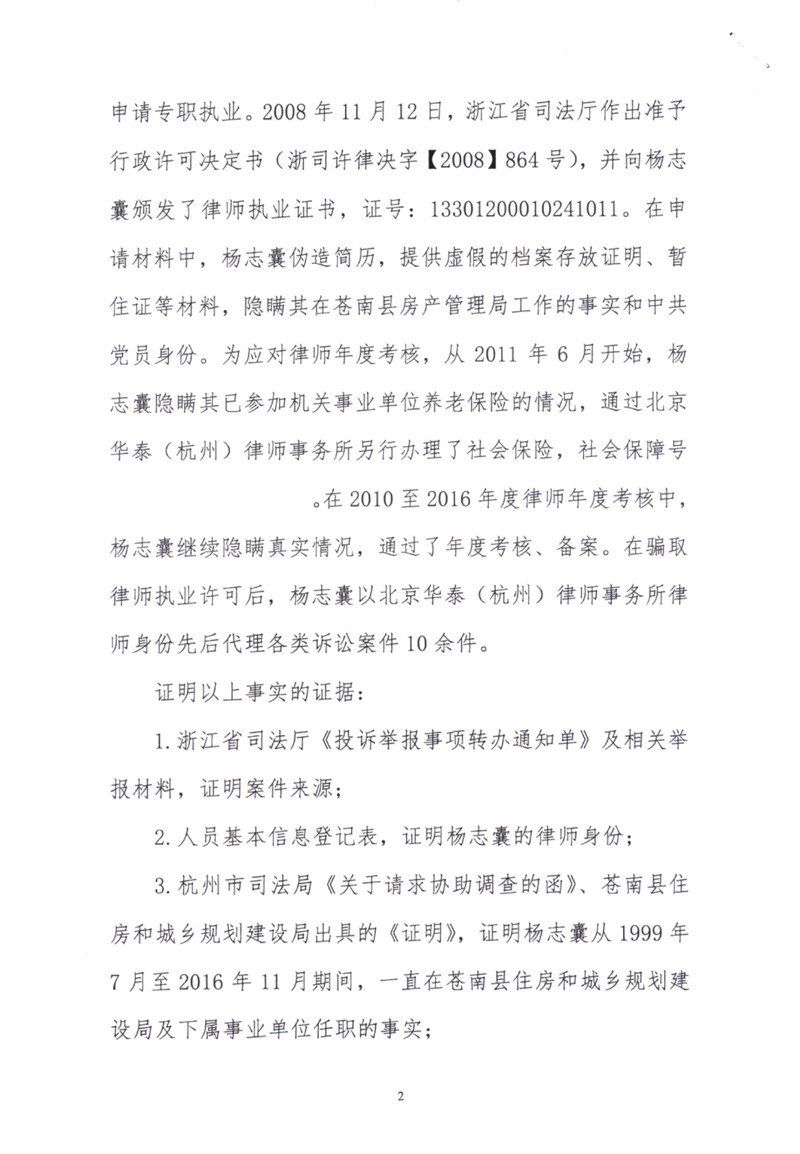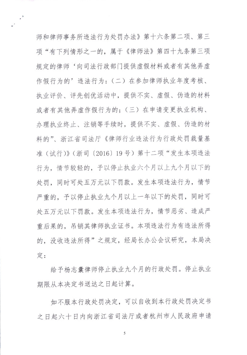 浙江杨志囊律师因弄虚作假被停止执业九个月