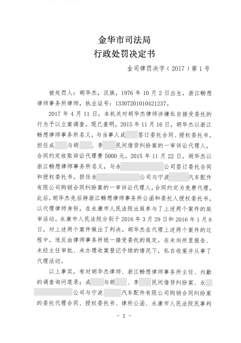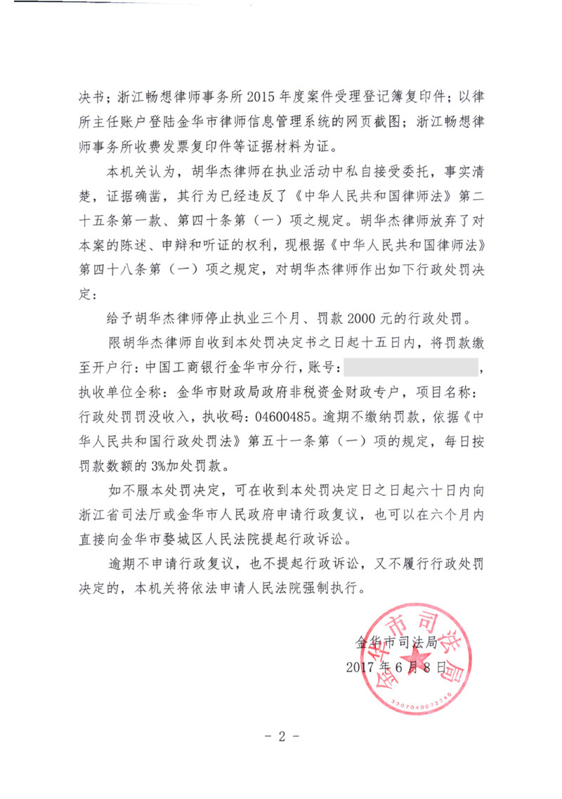 浙江胡华杰律师因私自接受委托受停止执业三个月处罚,并处罚款