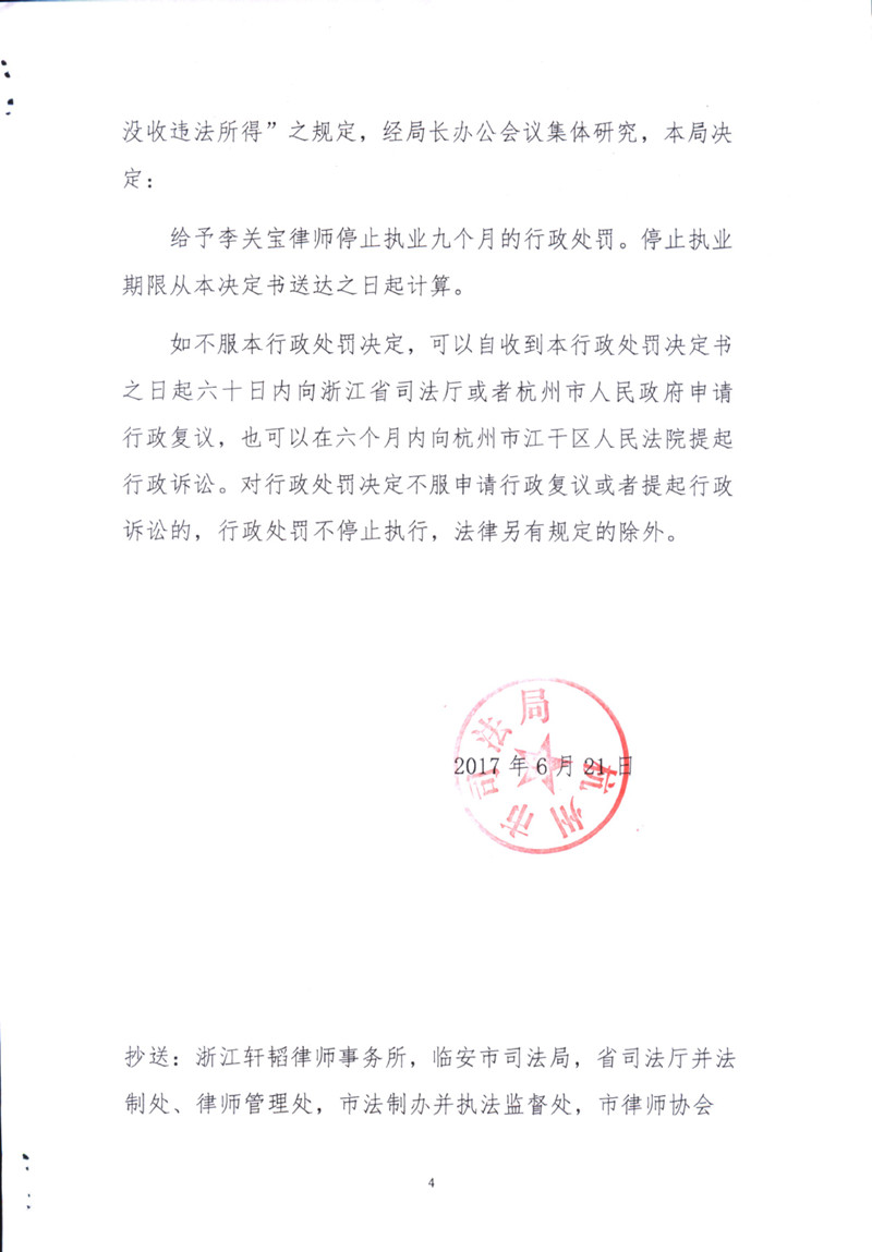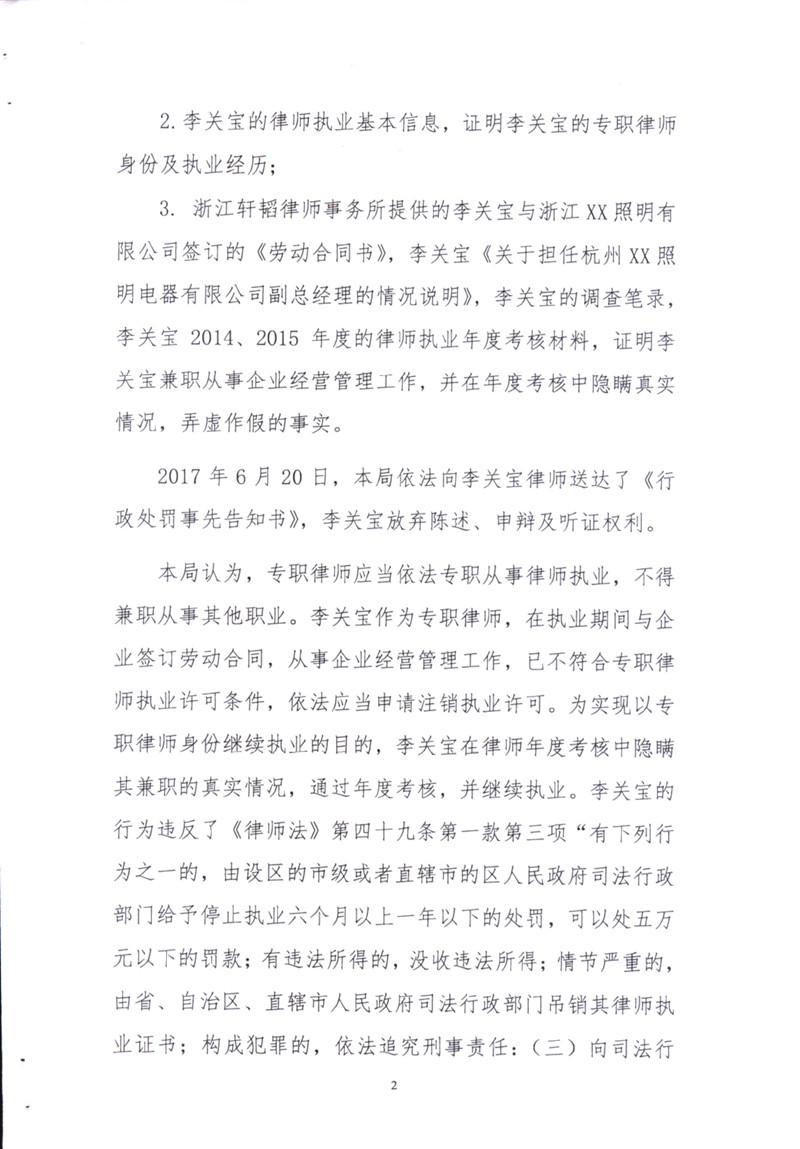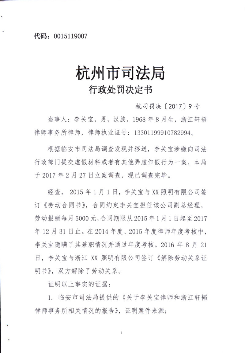 浙江李关宝律师因向司法行政机关提供虚假材料,有弄虚作假行为,受停止执业九个月处罚