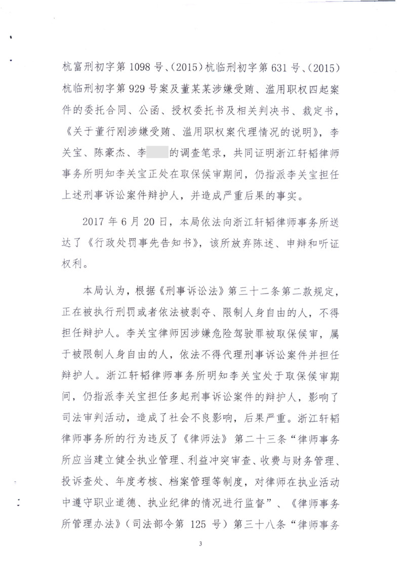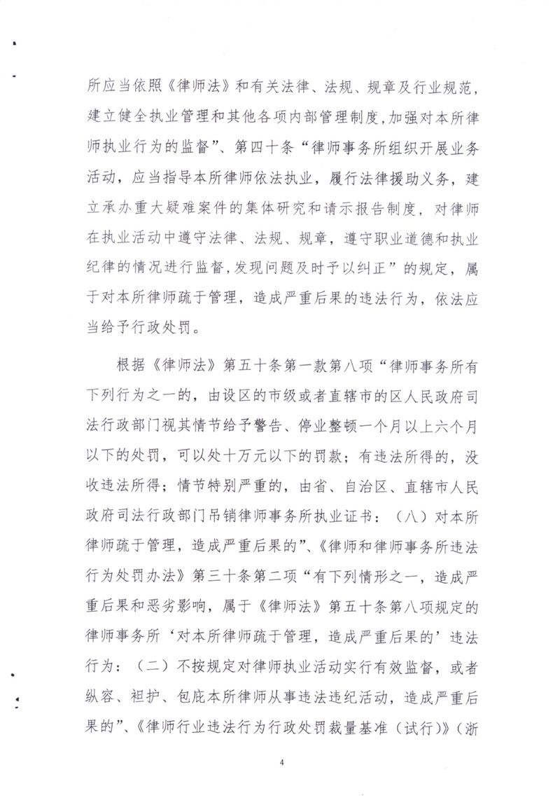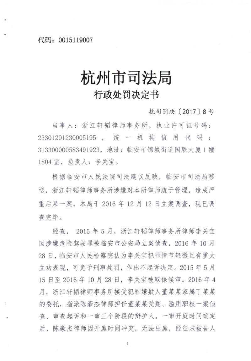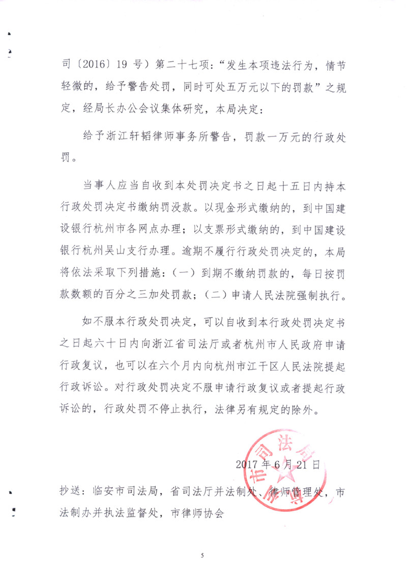 浙江轩韬律师事务所因对本所律师疏于管理,造成严重后果,受警告处罚,并处罚款