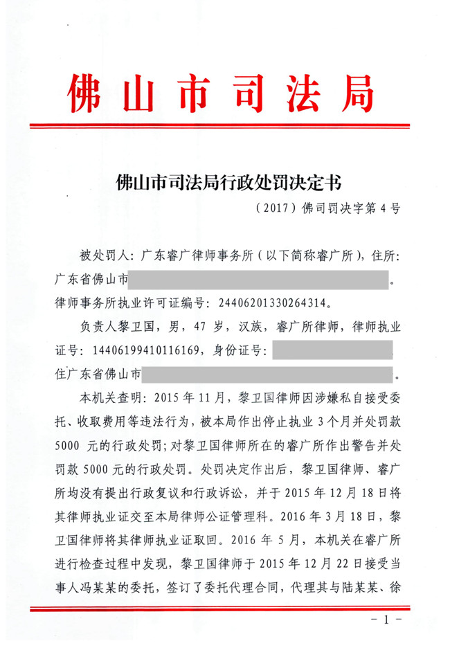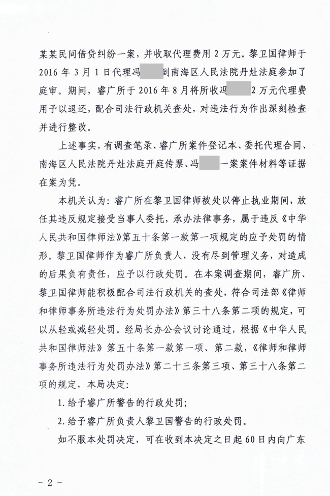 广东睿广律师事务所在黎卫国律师被处以停止执业期间,放任其违反规定接受当事人委托,承办法律事务被处警告