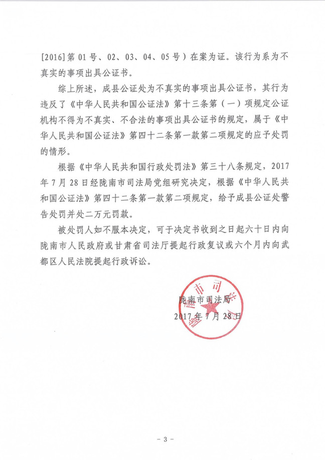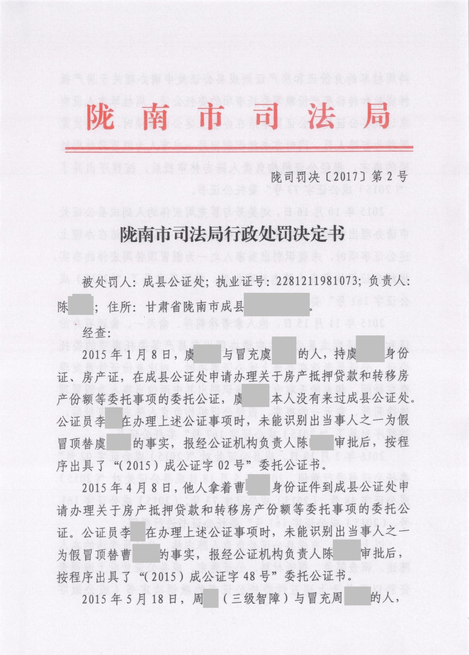 成县公证处因为不真实的事项出具公证书受警告及罚款处罚
