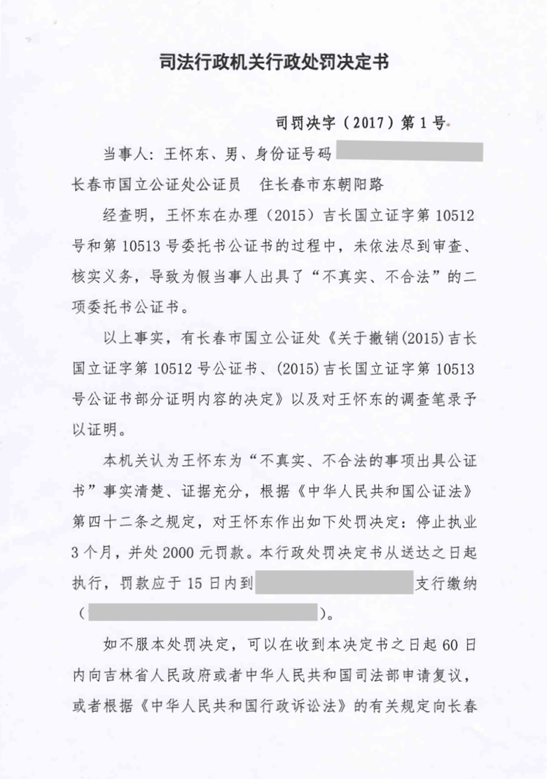 公证员王怀东因为不真实、不合法的事项出具公证书受停业、罚款处罚