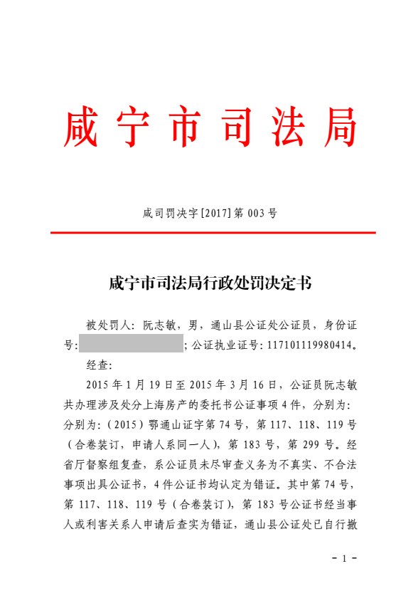 公证员阮志敏为不真实、不合法事项出具公证书受警告、罚款处罚