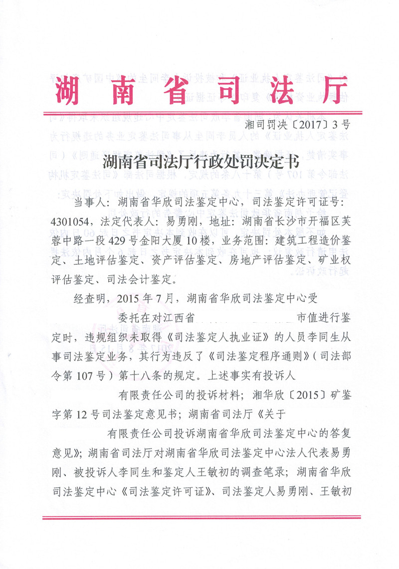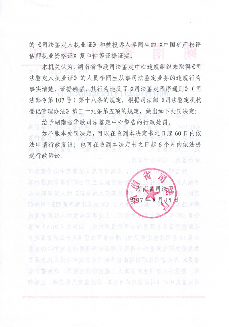 湖南省华欣司法鉴定中心因组织未取得《司法鉴定人执业证》的人员从事司法鉴定业务被警告