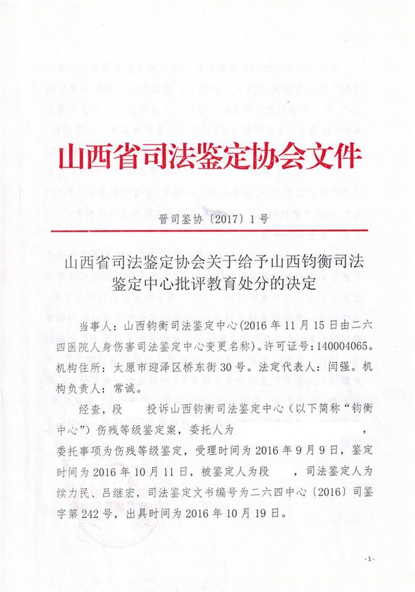 山西钧衡司法鉴定中心因司法鉴定意见书内容不严谨受批评教育处分