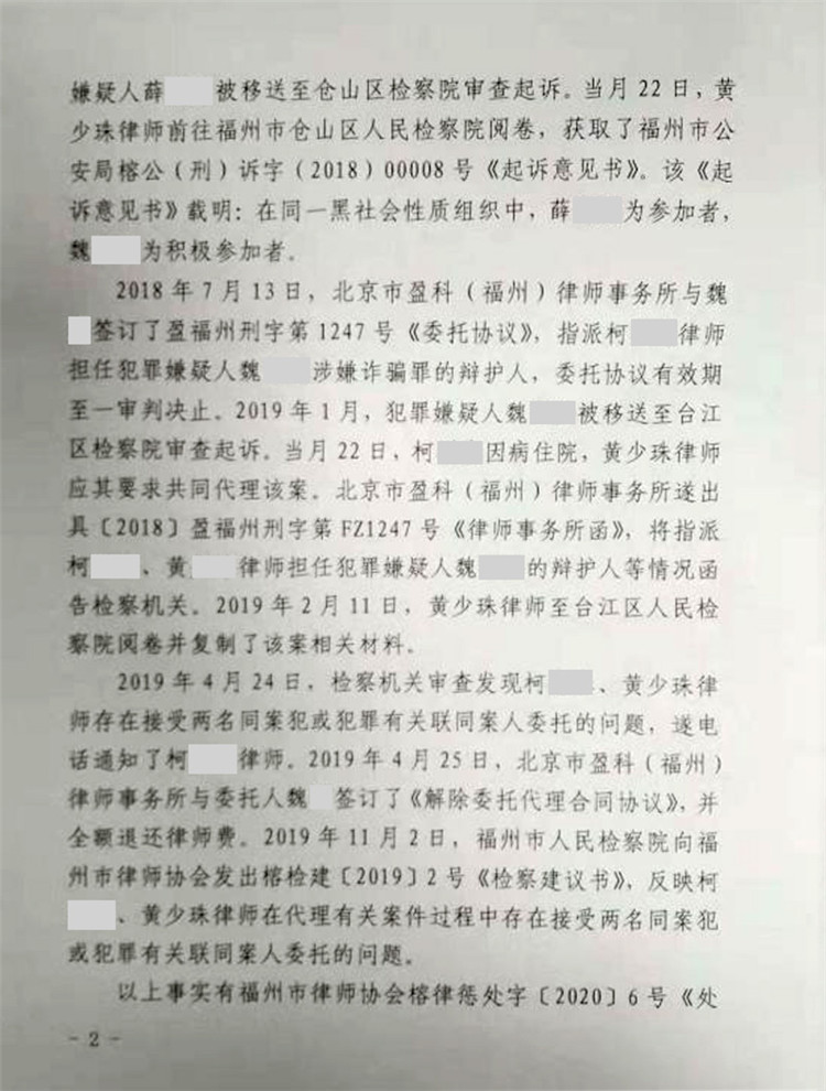 福建律师黄少珠因接受未同案处理但实施的犯罪存在关联的其他犯罪嫌疑人、被告人的委托担任辩护人被处警告