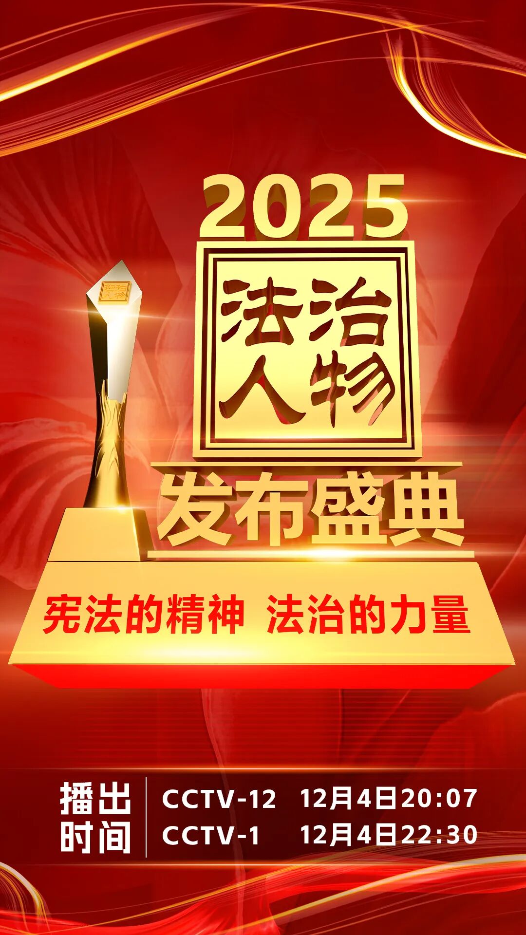 今年12月4日是第12个“国家宪法日”。由中央依法治国办、司法部、全国普法办和中央广播电视总台共同主办的“宪法的精神 法治的力量——2025年度法治人物”宣传活动专题节目,将于12月4日晚在央视综合频道和社会与法频道播出。届时,将揭晓10位“2025年度法治人物”和4位“致敬英雄”人物。