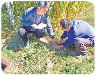 马建新现场测量土地,调解田某5兄弟之间土地纠纷。