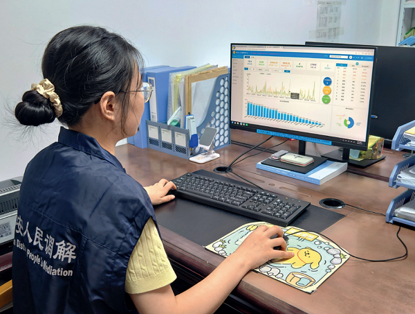 宝安区西乡街道人民调解委员会调解员在“i调解”智慧管理平台查看调解数据分析