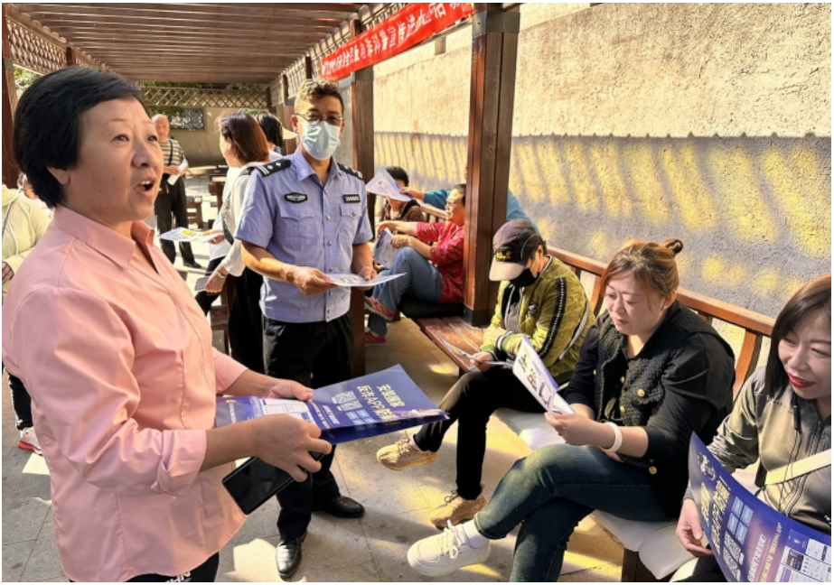图为曲士伟(左)与社区民警走进社区居民中开展防诈骗法治宣讲。 资料图片