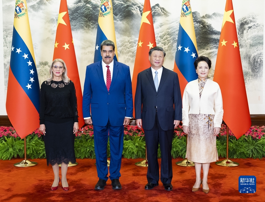 习近平夫人彭丽媛和马杜罗夫人弗洛雷斯陪同参加欢迎仪式。当晚,习近平和彭丽媛在人民大会堂金色大厅为马杜罗和弗洛雷斯举行欢迎宴会。