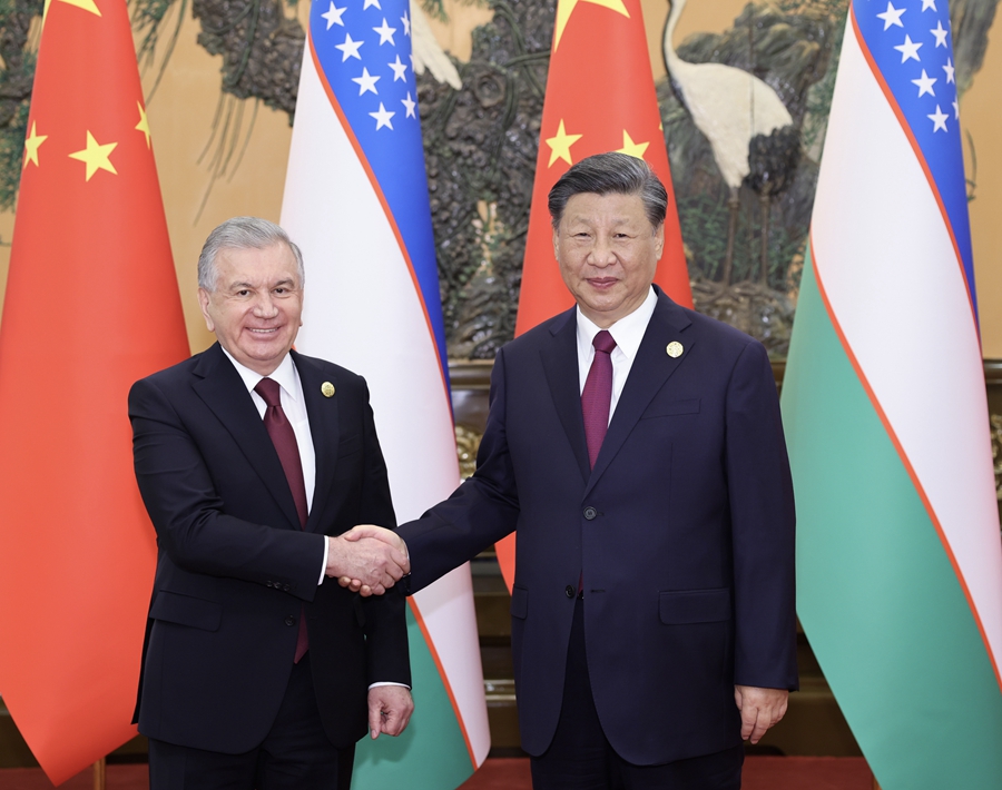 10月17日下午,国家主席习近平在北京人民大会堂会见来华出席第三届“一带一路”国际合作高峰论坛的乌兹别克斯坦总统米尔济约耶夫。新华社记者 刘彬 摄