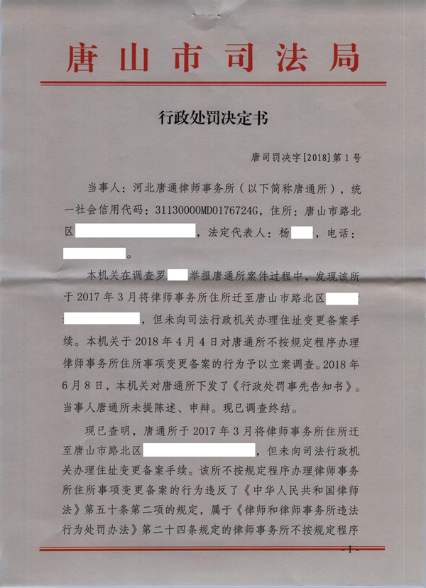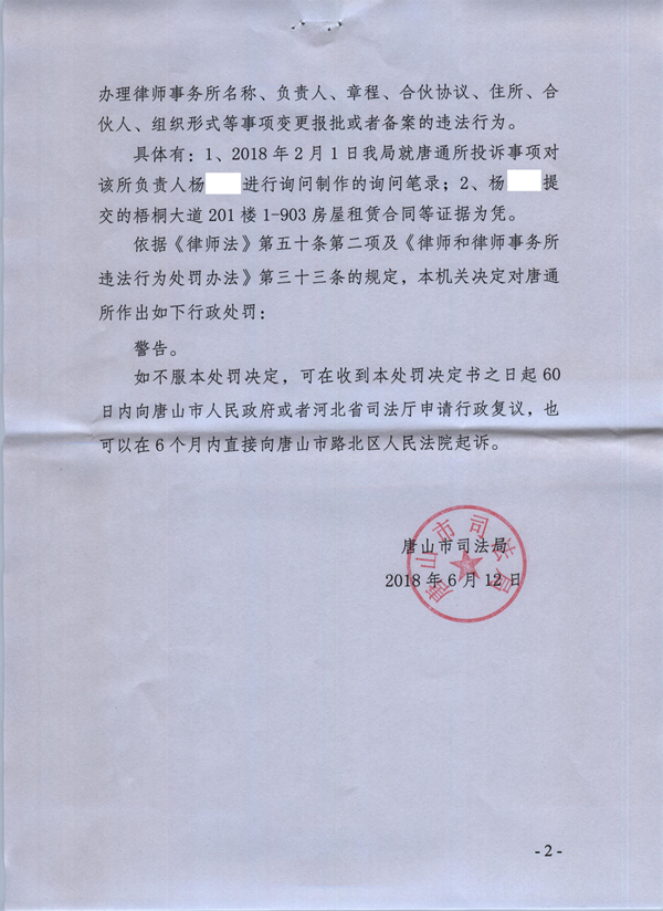 河北唐通律师事务所因违法变更住所被处警告