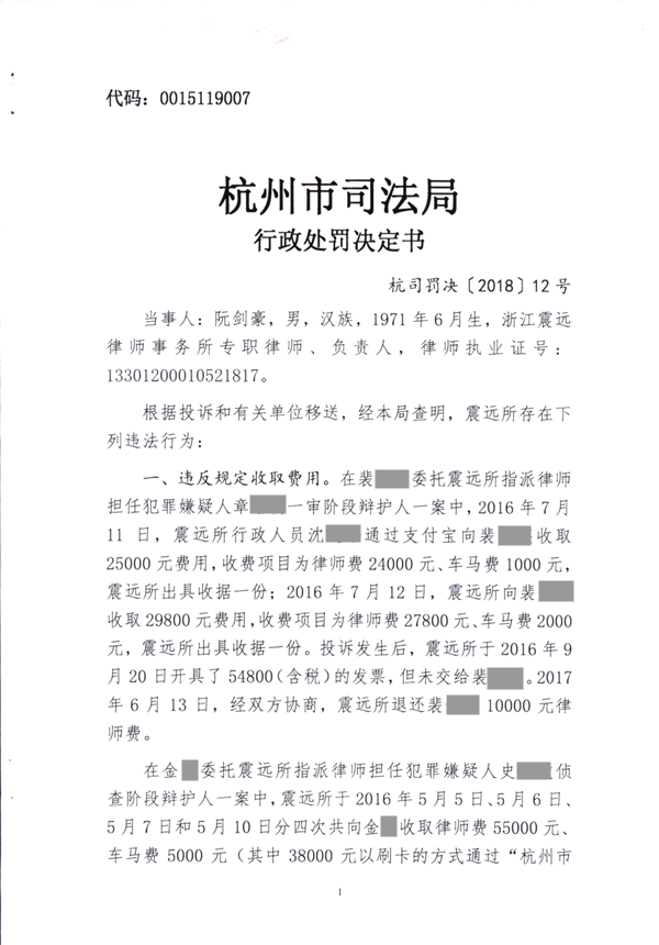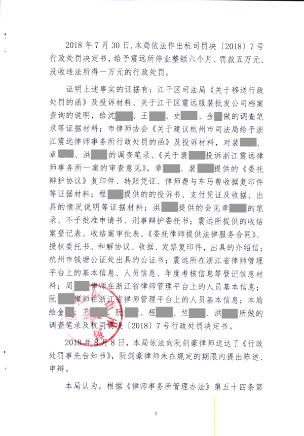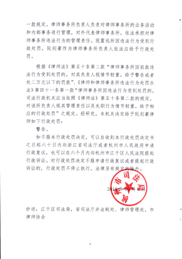 浙江阮剑豪律师因律所负责人履行管理职责不力被处警告