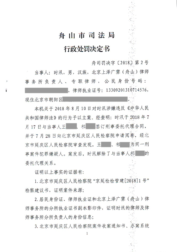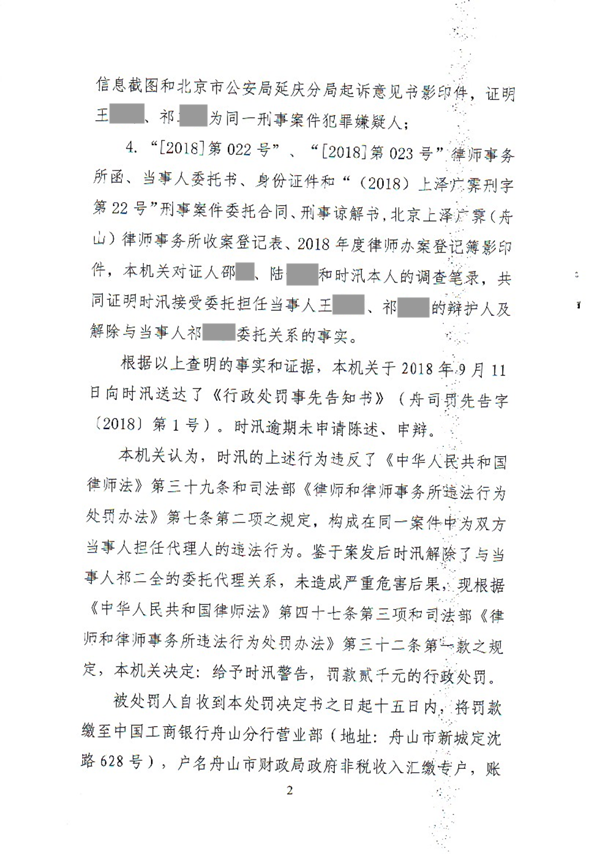 浙江时汛律师因违反利益冲突规定被处警告、罚款贰千元