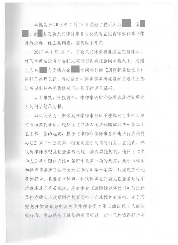 安徽龙兴律师事务所因违反收费规定被处警告、孟宪肖律师因违反收费规定被处停止执业五个月、林飞律师因违反收费规定被处警告