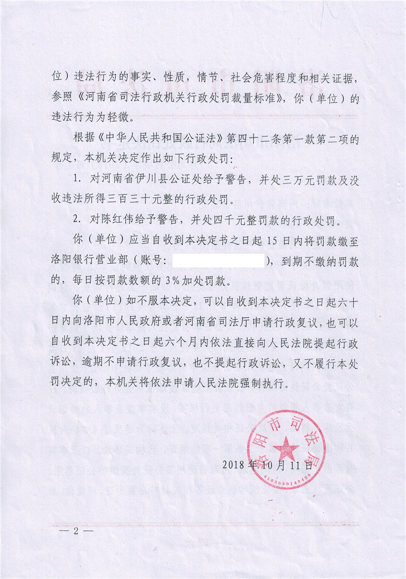 河南省伊川县公证处、陈红伟因为不真实、不合法事项出具公证书受警告、罚款处罚
