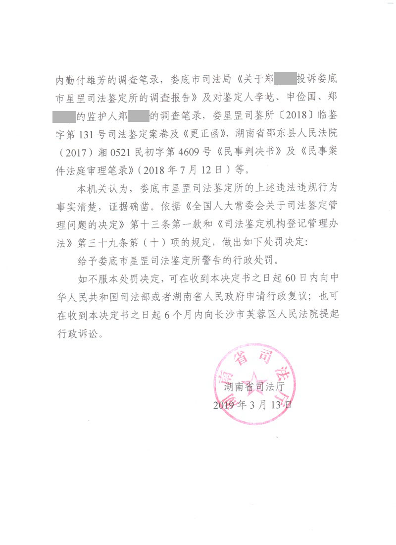 湖南省娄底市星罡司法鉴定所因指定了两名不具有相关专业高级专业技术职称的鉴定人实施重新鉴定受到警告的行政处罚